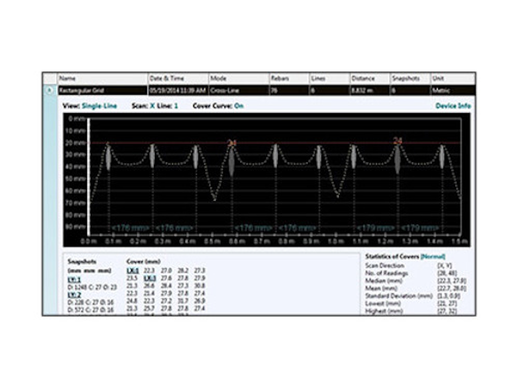 Das Gerät ist das perfekte Werkzeug zum Auffinden von Bewehrungsstäben, zum Bohren von Löchern, zum Messen der Betondeckungstiefe, zur Abnahme der Abdeckung nach dem Entfernen der Schalung und zur Qualitätssicherung in der Serienfertigung von Betonfertigteilen. Es unterstützt auch die statistische Auswertung des Erfassungsbereichs nach der DBV-Richtlinie des Deutschen Verbandes für Beton- und Bautechnik.