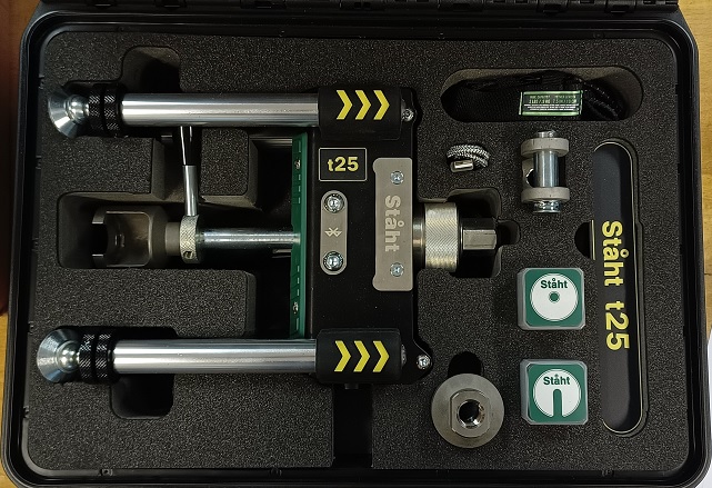 Ankerprüfgerät Staht t25 - 25 kN: Das Ankerprüfgerät Staht T25 hat einen Messbereich von bis zu 25 kN und gibt Aufschluss über die Haltekraft von Dübeln in einer Vielzahl von Materialien. Das Gerät wird als kompletter Bausatz mit Zubehör wie Gewinde- und Schlitzadaptern geliefert. Ein Gabelkopf für die Prüfung von Ösenankern ist ebenfalls im Lieferumfang enthalten.