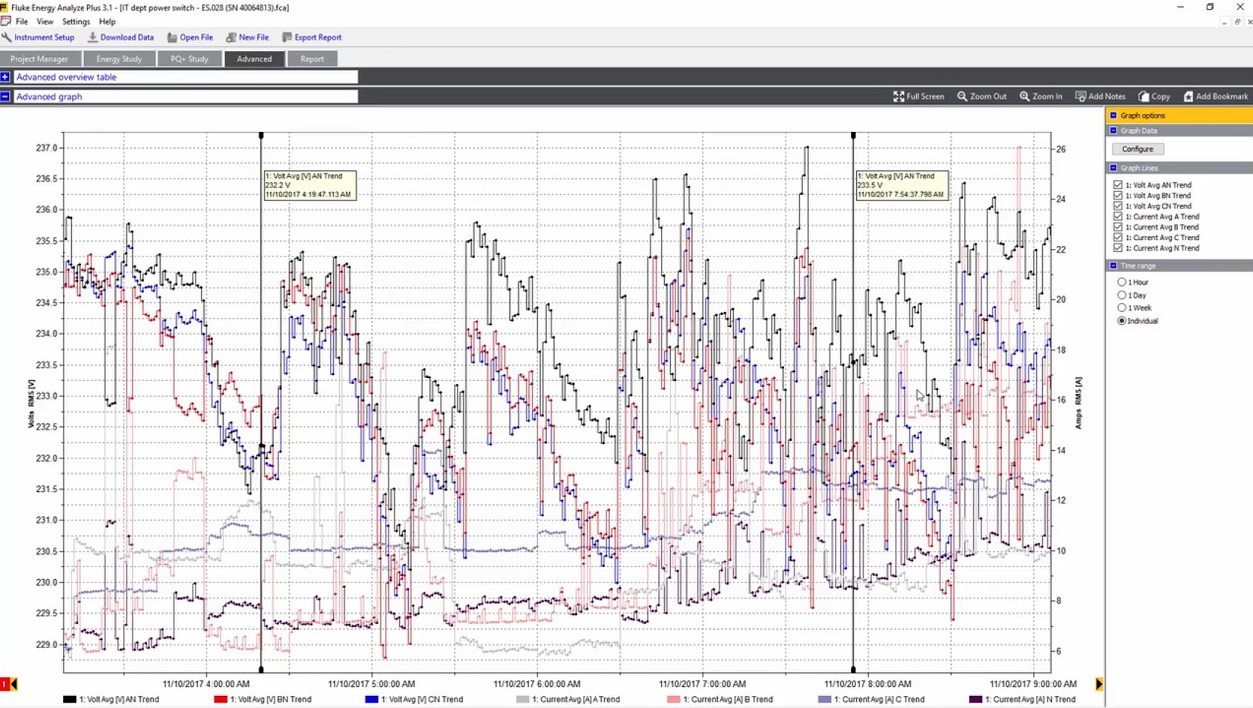 Das Gerät wird standardmäßig mit der Software Fluke Energy Analyze Plus geliefert. Dieses Paket ist so konzipiert, dass jeder ohne umfangreiche Schulung sofort loslegen kann. Sie können Energiedaten einfach vom Messgerät herunterladen, um sie zu analysieren und für die Berichterstellung zu verwenden. Die Messwerte können mit historischen Werten und Industriestandards verglichen werden, um ein vollständiges Bild von der Netzstromqualität in Ihrem Gebäude zu erhalten.