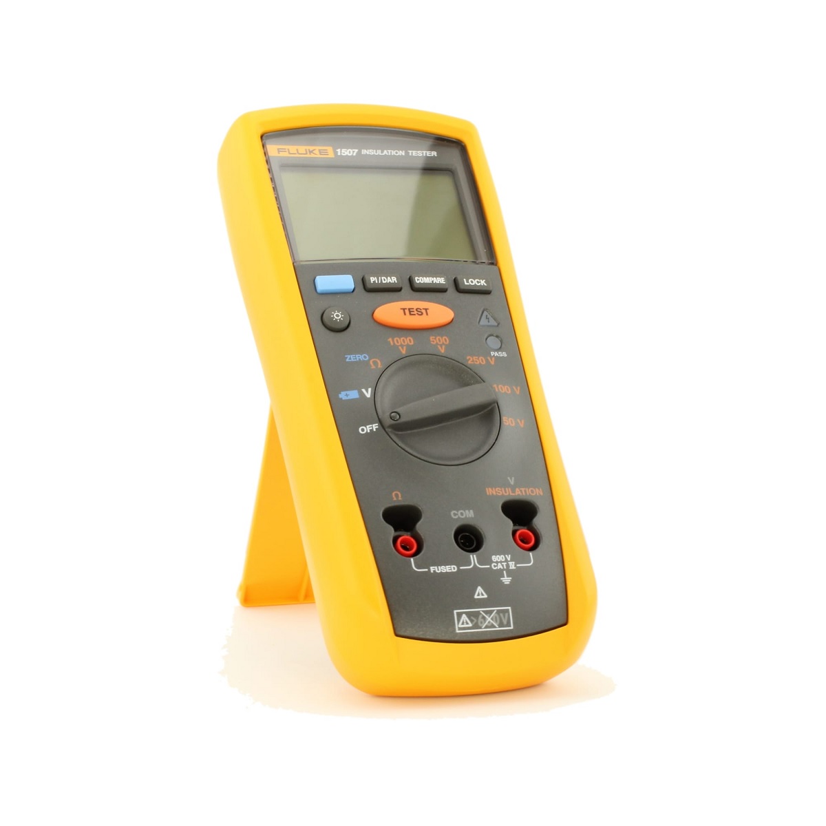 Das Fluke 1507 ist ein präzises Isolationswiderstandsmessgerät für die Durchführung von Isolationsprüfungen bis zu 1000V (1kV). Das Gerät hat einen Isolationsprüfbereich von 0,01MΩ bis 10GΩ und Isolationsprüfspannungen in den Stufen 50V, 100V, 250V, 500V und 1000V. Darüber hinaus bietet das 1507 eine automatische Berechnung des Polarisationsindexes und der dielektrischen Absorptionsrate sowie eine Vergleichsfunktion.